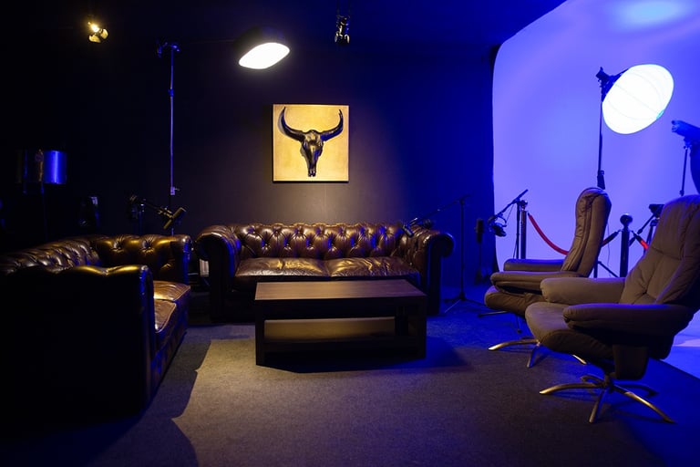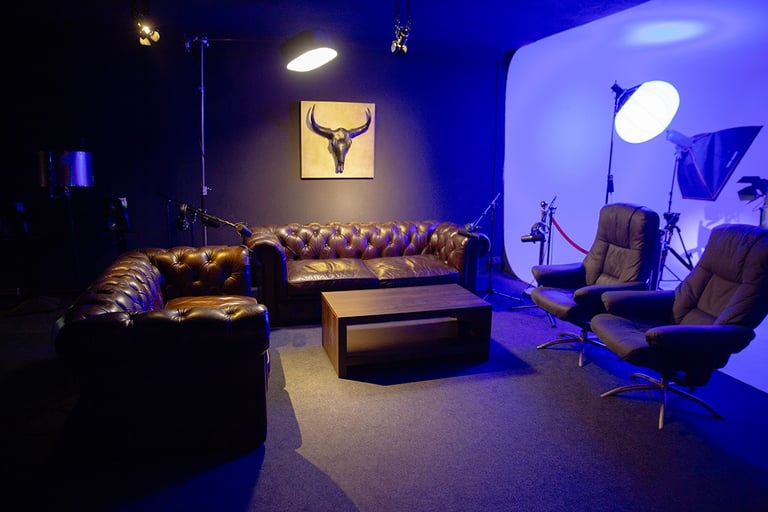 Die offene Studiofläche ohne störende Ecken oder Trennwände bietet ideale Bedingungen für Mehrkamera-Setups und dynamische Gesprächsformate. Bis zu 30 Personen finden im Studio Platz – für größere Teams, Interviewpanels oder kleinere Live-Veranstaltungen mit Publikum. Die großzügige Fläche erlaubt zudem eine individuelle Lichtgestaltung und variable Kamerapositionen.